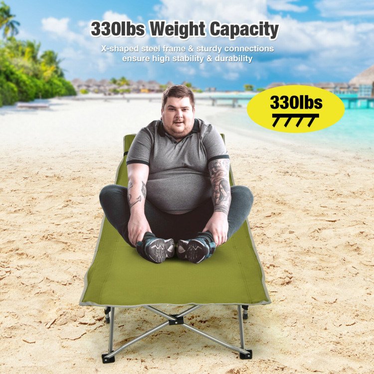 Durable dual-layer oxford cloth is soft and breathableSolid steel tubes ensure high stability; sturdiness; and durabilityX-shaped structure and reinforced connections for high load capacityWidened anti-sink footpads without worrying about sinkingA folding cot can be packed into a carrying bag for easy transportMatching pillow and elevated cot can relieve the fatigue of the head and neckSide storage pocket keeps the private items in order with easy access